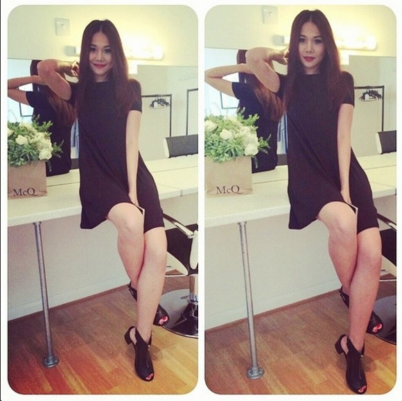 | Mẫu bốt khoét có chiều cao 5 cm được Thanh Hằng kết hợp rất nữ tính với đầm liền suông đen. |