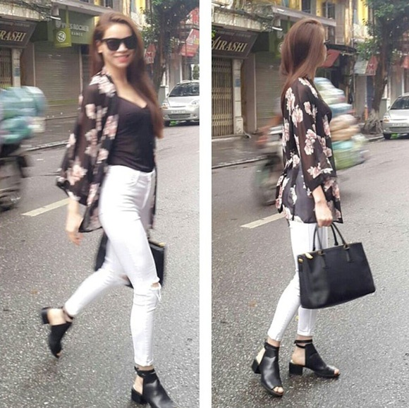 | Với trời thu, cô mix kểu bốt này với quần skinny và áo khoác kimono. |