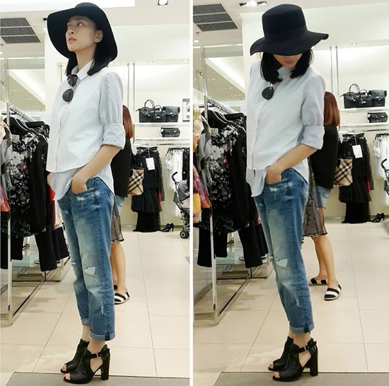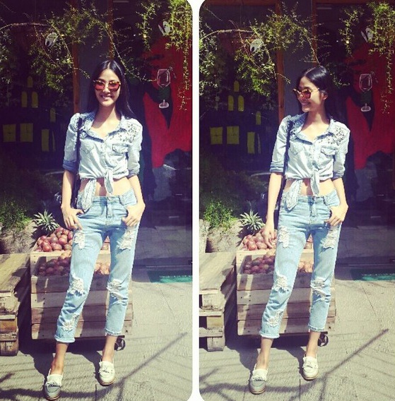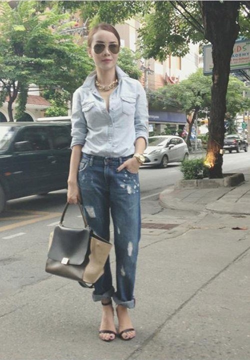 10: Diện cả cây denim: Trang phục cùng chất liệu và có sự tương đồng về màu sắc sẽ làm giảm cảm giác phân chia cơ thể, giúp bạn cao ráo hiệu quả như Yến Trang.