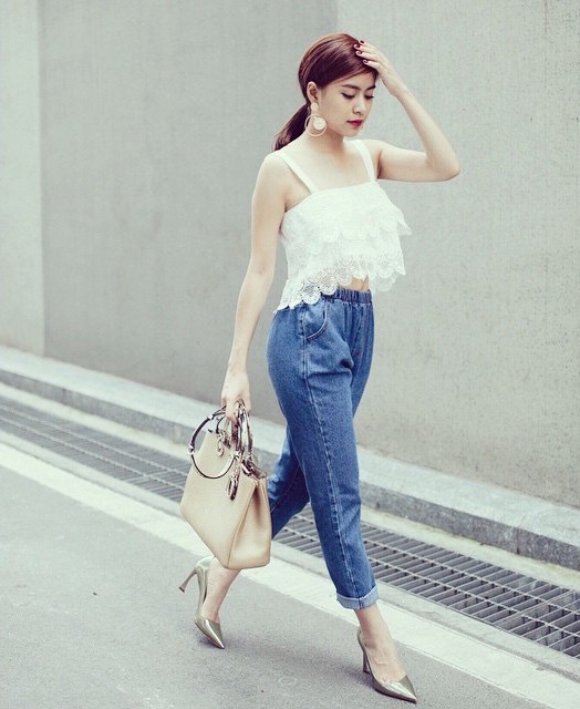1. Mặc cùng crop top: Do mẫu quần rộng dễ làm đôi chân bị mất dáng và ngắn hơn, nhưng bạn đã tạo được sự cân bằng với khoảng eo hở, nhờ thế mà cảm giác đôi chân được dài ra hơn.