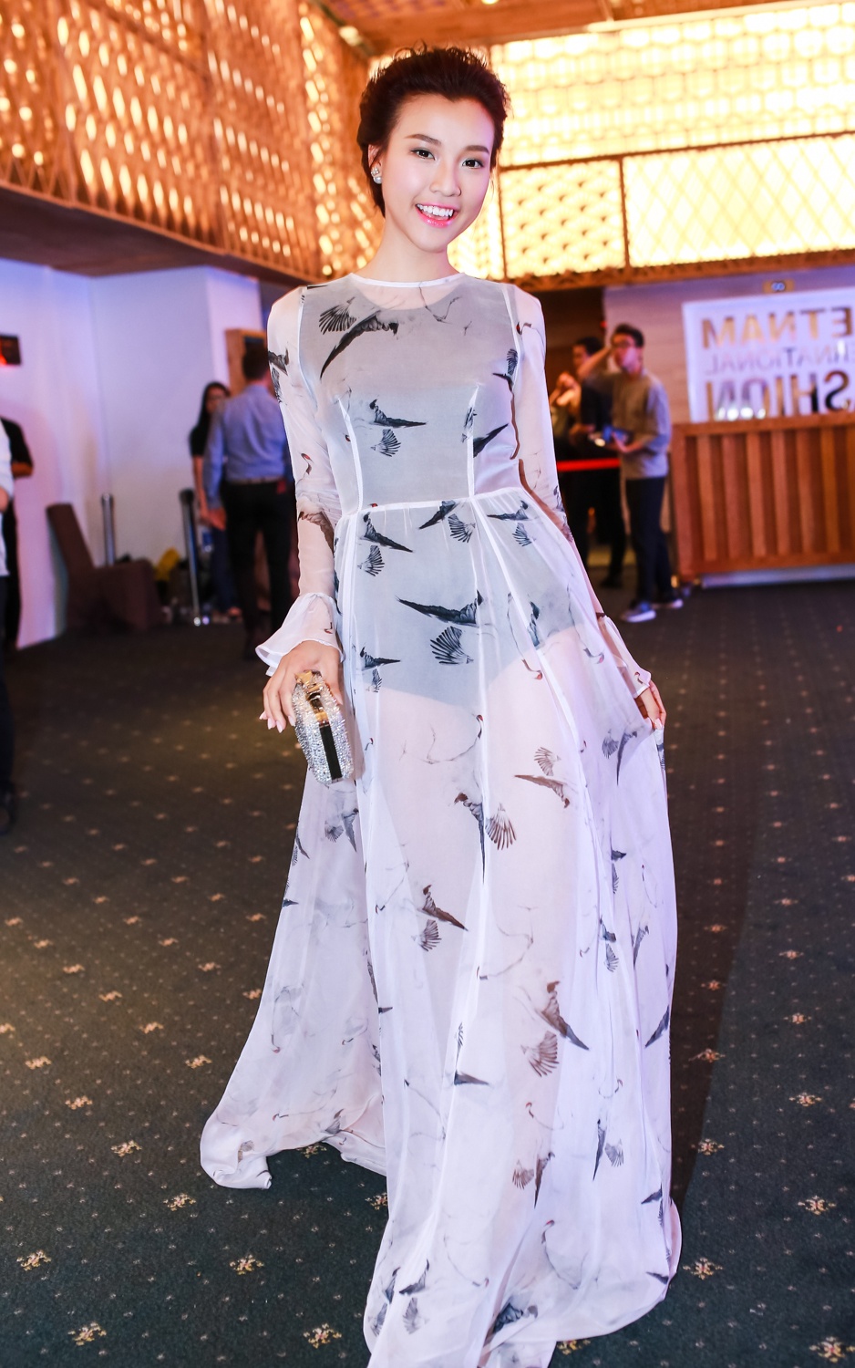 Hoa hậu Thùy Dung cũng có mặt trong danh sách này. Trang phục người đẹp Đà Nẵng diện khi xuất hiện trong ngày thứ 2 Tuần lễ thời trang quốc tế Việt Nam được khen ngợi là tinh tế và ý nhị. Chất voan, tông trắng được điểm hoa nhẹ nhàng khéo khoe bờ vai trần quyến rũ.