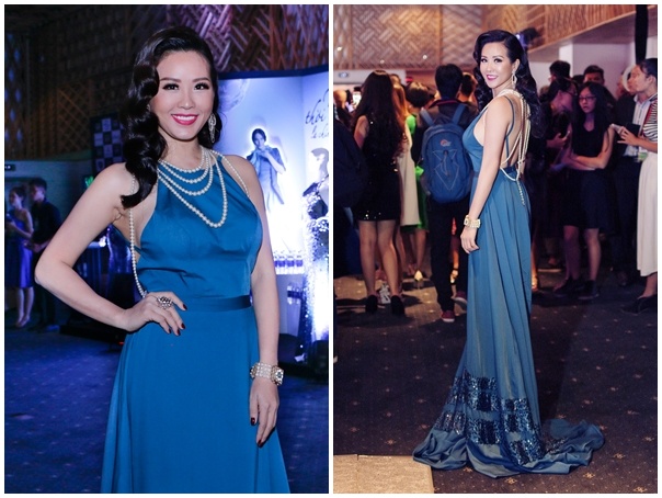 | Tham dự sự kiện thời trang gây chú ý tuần qua, Thu Hoài chọn đầm dạ hội, hơi hướm áo yếm. Bộ cánh tông xanh có chất lụa mềm mại tôn vẻ đẹp quyến rũ và trẻ trung của bà mẹ ba con. |