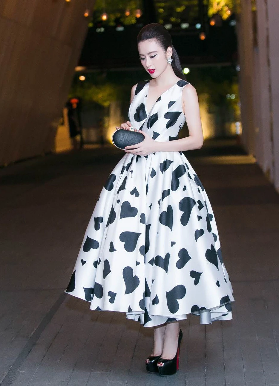 | Phương Trinh diện đầm phom xòe, họa tiết trái tim của NTK Đỗ Mạnh Cường dự sự kiện thời trang đêm khai mạc. Thiết kế cổ điển, thanh lịch cùng họa tiết hiện đại phù hợp nước da cũng như tông trang điểm và tóc. |