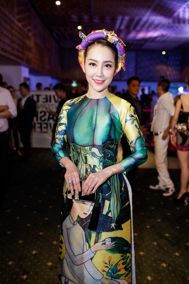 | Linh Nga diện áo dài cách tân của Thủy Nguyễn khi đến ủng hộ bộ sưu tập Lúng liếng của nhà thiết kế. Áo dài họa tiết tranh vẽ có sắc màu trầm đậm nét truyền thống Việt giúp "chim công làng múa" trở thành tiêu điểm ở chương trình. Bà mẹ một con còn khéo léo đội khăn vấn duyên dáng. |