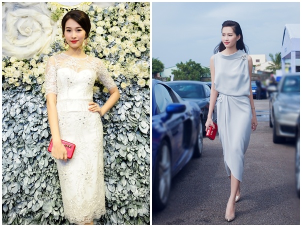 | Vóc dáng mảnh mai giúp Đặng Thu Thảo dễ dàng ứng dụng style cổ điển, lịch thiệp. Tại buổi khai trương showroom của Lê Thanh Hòa, người đẹp sinh năm 1991 diện đầm ren trắng nền nã. Vài ngày sau, cô tham dự sự kiện với thiết kế tông xanh pastel nhạt. Ảnh: Khoa Nguyễn, An Trần |