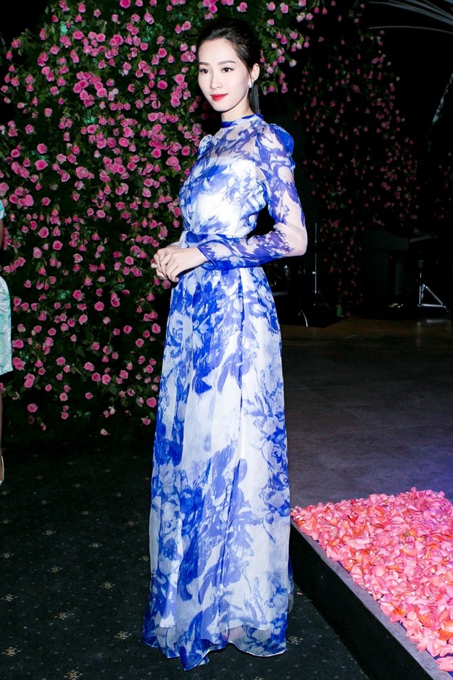 | Trên thảm đỏ sự kiện Tuần lễ thời trang quốc tế Việt Nam, người đẹp 24 tuổi ghi điểm hình ảnh với bộ đầm dài, chất liệu voan mỏng, in họa tiết sắc xanh nổi bật. Cùng với trang phục lãng mạn, cô trang điểm nhẹ, tóc búi đơn giản. Ảnh: Khoa Nguyễn |