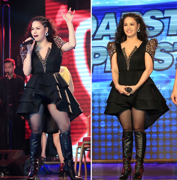 | Hương Tràm bị cho là già dặn trong phong cách thời trang. Trong ảnh, thiết kế voan mỏng, ánh kim loại còn khiến người mặc đầy đặn. Bốt cao cổ hoàn toàn không phù hợp vóc dáng khiêm tốn. Ảnh: Oscar |