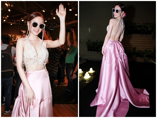 | Tại sự kiện tháng 4, Phương Trinh gây bất ngờ khi diện váy không nội y trên thảm đỏ. Thiết kế gây phản cảm bởi chuỗi hạt thưa thớt không đủ che chắn vòng 1. Ảnh: Thành Luân |
