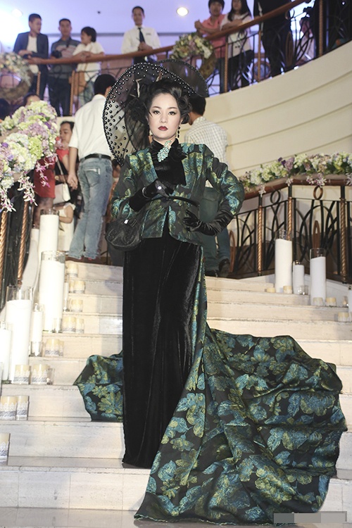 | Thúy Nga hóa trang hình ảnh mô phỏng thập niên 1940 dự sự kiện. Tuy nhiên, bộ cánh dành cho tầng lớp quý tộc những thập kỷ trước khiến danh hài trở nên nặng nề và sến sẩm. Ảnh: Bill |