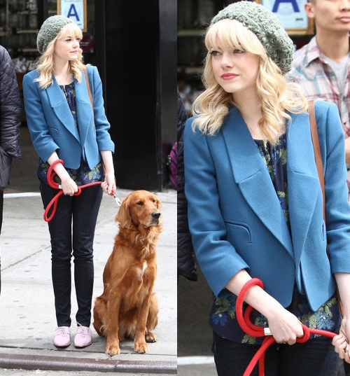 | Emma Stone trẻ trung dạo phố với áo hoa, giày oxford và blazer xanh. |