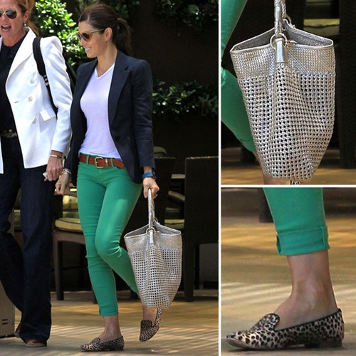 | Jessica Biel tăng điểm nhấn cho bộ trang phục nhiều tông xanh của mình với đôi giày loafer da báo. |