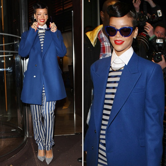 | Rihanna sành điệu với blazer dáng dài và tông kẻ xám - xanh phối màu đẹp mắt. |