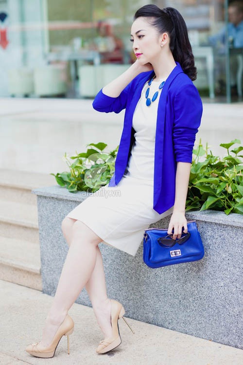| Linh Nga khéo léo mix màu đầm trắng với blazer xanh royal và phụ kiện bắt mắt. |