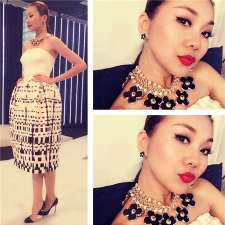 | Chiếc vòng cổ statement của Thanh Hằng giúp chiếc váy quây đỡ khoe da thịt hơn. |