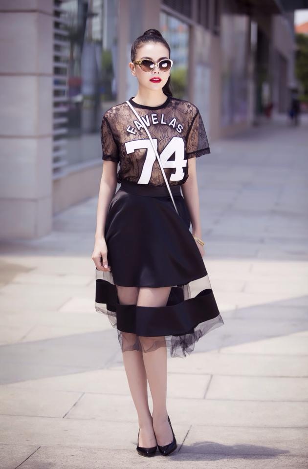 | Trà Ngọc Hằng chọn áo ren in số để tạo cảm giác kín đáo hơn. |