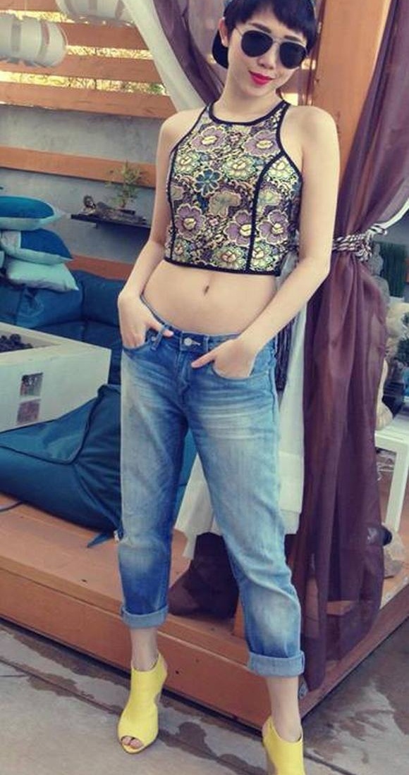 Tóc Tiên đầy cá tính với áo crop top và quần boyfriends.