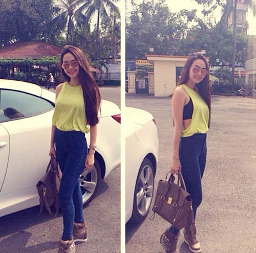 Minh Hằng khỏe khoắn với trang phục dạo phố kết hợp cùng áo khoét nách sâu và bra top.