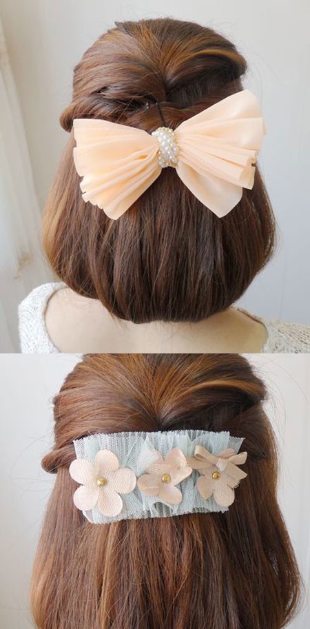 Nếu mái tóc của bạn dài gần chấm vai và không bị tỉa quá nhiều, thì tóc buộc nửa có lẽ là kiểu tóc thích hợp nhất vào thời điểm mùa thu. Gọn gàng, nữ tính và không kém phần cuốn hút, cách làm tóc này dễ dàng che lấp những sợ tóc lởm chởm trên đỉnh đầu, lại vừa khiến phần tóc phía sau thêm mềm mại.