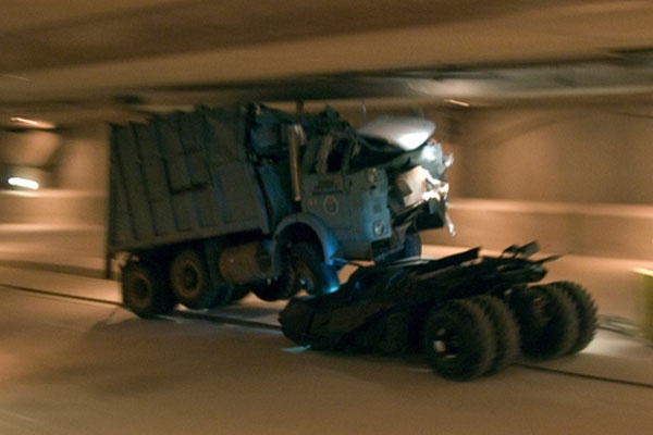 Batmobile đấu đầu xe chở rác trong The Dark Knight (2008): Trong một cảnh đuổi bắt giữa phim, người xem kinh ngạc khi thấy chiếc Batmobile của Người Dơi lao thẳng rồi hất tung chiếc xe chở rác do tay chân của tên Joker điều khiển. Khán giả nghi ngờ Christopher Nolan đã sử dụng kỹ xảo, nhưng thực tế, ông tạo ra cảnh quay bằng cách tạo ra mô hình nhỏ bằng 1/3 kích cỡ thật của hai chiếc xe. Sau đó, Nolan để chúng lao thẳng vào nhau ở tốc độ tối đa. |