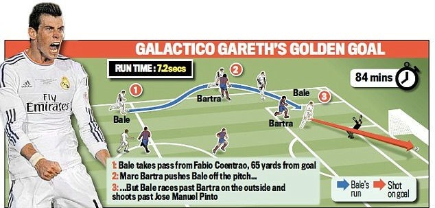 | Trong trận chung kết cúp nhà vua năm 2014, Gareth Bale nhận bóng từ Fabio Coentrao ở vị trí cách khung thành Barcelona khoảng 59 m. Sau đó, Marc Bartra cố gắng đẩy Bale ra ngoài sân. Tuy nhiên, Bale dùng tốc độ vượt qua Bartra và thực hiện pha dứt diểm đánh bại thủ môn Pinto. Ảnh: Daily Mail. |