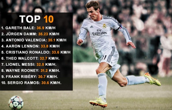 Việc Gareth Bale chiếm vị trí số một không gây bất ngờ. Mùa trước, anh gây ấn tượng khi có pha bứt tốc ở chung kết cúp nhà Vua diễn ra vào tháng 4/2014. Trên sân Mestalla của CLB Valencia, Gareth Bale dùng tốc độ vượt qua Marc Bartra. Theo thống kê của trang Daily Mail, anh chạy 59 m trong 7,2 giây và sau đó ghi bàn vào lưới Barca.