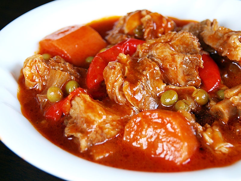 Kaldereta: Món hầm này trước kia được làm từ thịt dê, nhưng giờ có thể sử dụng thịt bò hoặc thịt lợn thay thế. Thịt được thái miếng to, đun nhừ với khoai tây, cà chua và thêm sốt gan, tạo hương vị đậm đà, thơm ngậy. Ảnh: Recipeshubs. |