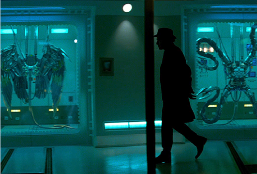 | Nhân vật bí ẩn đi ngang qua đôi cánh của Vulture và vòi bạch tuộc của Doc Ock ở gần cuối phim. |