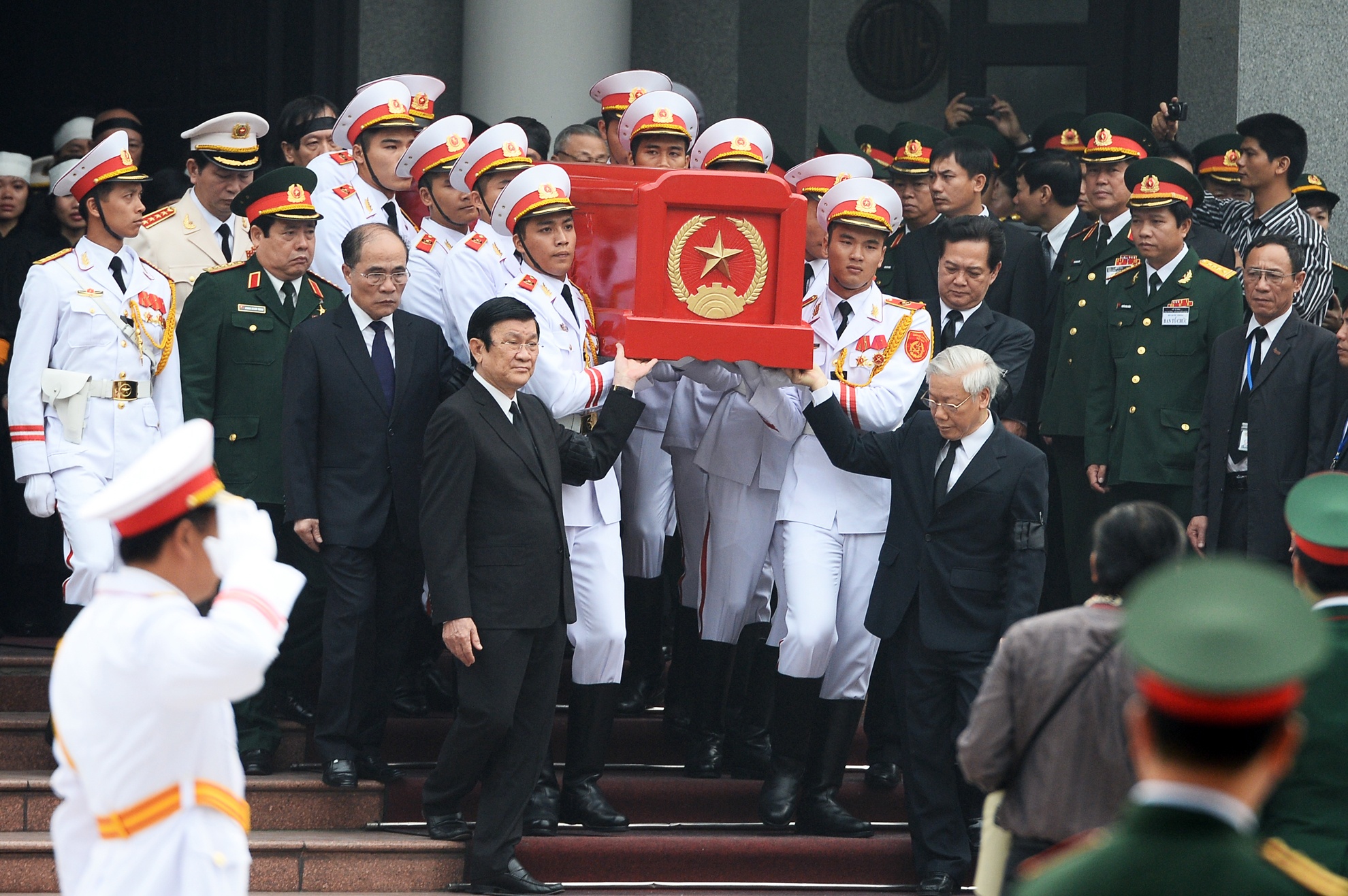 | Sáng 13/10, sau 2 ngày treo cờ rủ Quốc tang, lễ truy điệu và đưa tang Đại tướng được cử hành trọng thể. Tổng bí thư Nguyễn Phú Trọng, Chủ tịch nước Trương Tấn Sang, Thủ tướng Nguyễn Tấn Dũng, Chủ tịch Quốc hội Nguyễn Sinh Hùng cùng nhiều quan chức cấp cao khác đưa tiễn linh xa Đại tướng. |