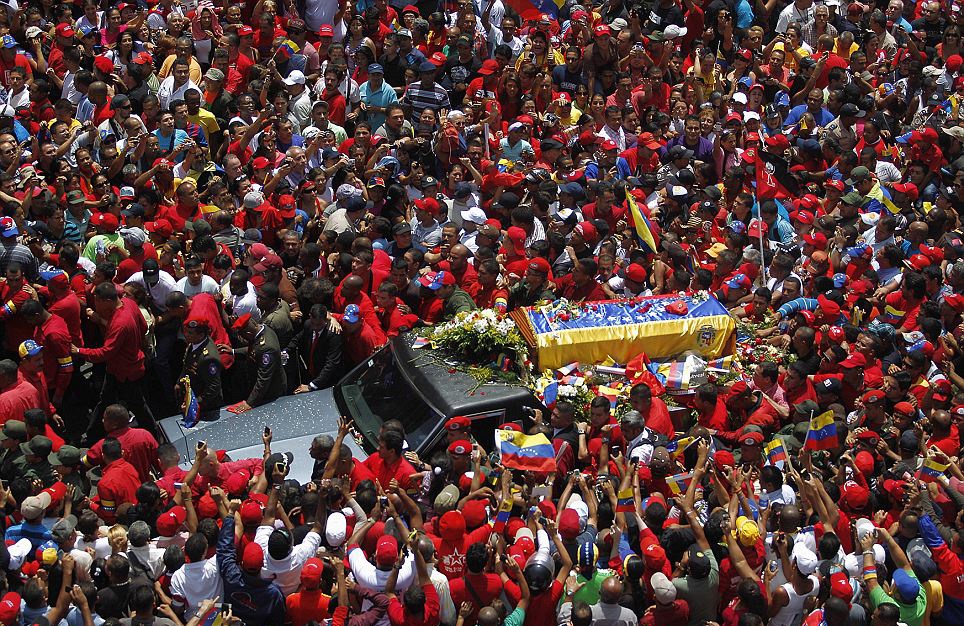 | Biển người Venezuela đi bên cạnh quan tài của nhà lãnh đạo quá cố Hugo Chavez tại Caracas sau khi ông qua đời vì ung thư ngày 6/3. Ảnh: Reuters. |