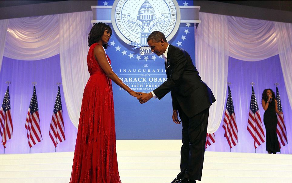 | Tổng thống Barack Obama cùng đệ nhất phu nhân Michelle Obama trong lễ nhậm chức tổng thống Mỹ nhiệm kỳ 2 tại Washington ngày 21/1. Trong khi đó, ca sĩ Jennifer Hudson (phải) đang biểu diễn phía sau. Ông Obama giành chiến thắng trước đối thủ Mitt Romney trong cuộc chạy đua vào Nhà Trắng cuối năm 2012. Ảnh: Reuters. |