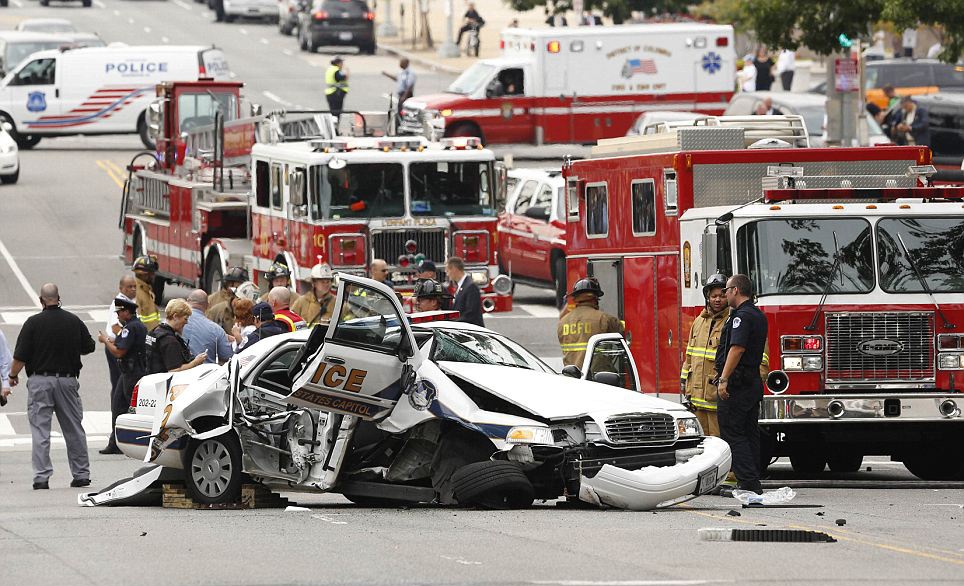 | Nhân viên cứu hộ đang làm việc bên cạnh một chiếc xe cảnh sát méo mó sau khi một vụ xả súng xảy ra gần Đồi Capitol ở Washington ngày 3/10. Vụ việc xảy ra vào chiều 3/10 theo giờ địa phương. Các nhân chứng và các nhà chức trách cho hay, một người phụ nữ lái chiếc xe ô tô màu đen đã đâm xuyên qua rào chắn gần Nhà Trắng, sau đó phóng đến Đồi Capitol, nơi trụ sở Quốc hội Mỹ tọa lạc. Ảnh: Reuters. |