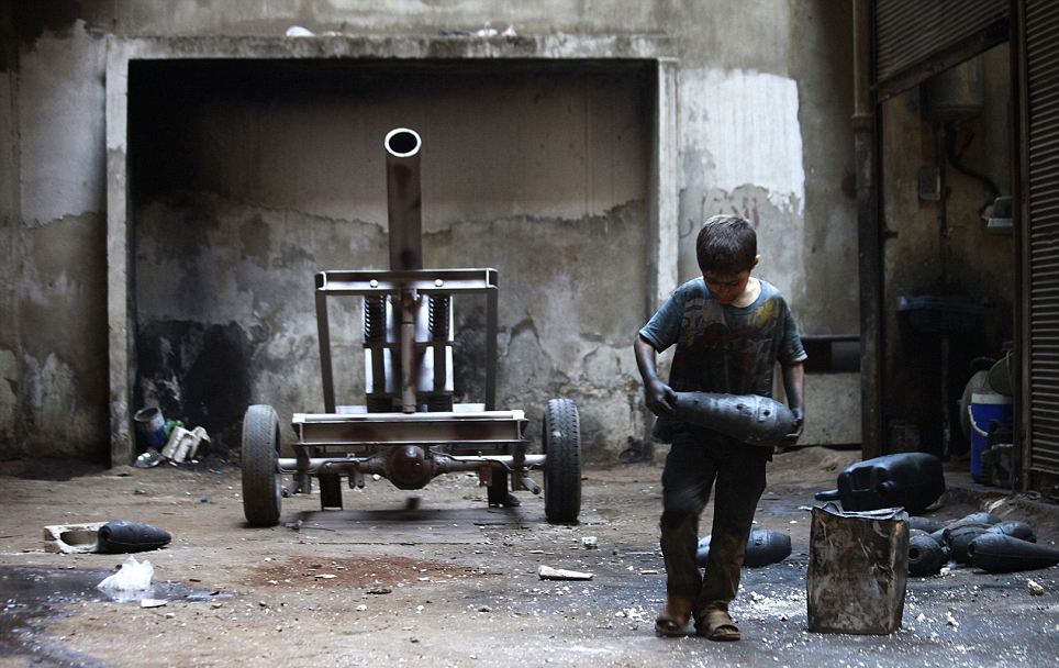 | Cậu bé Issa (10 tuổi) đang bê quả bom tại một nhà máy sản xuất vũ khí của Quân đội tự do Syria tại Aleppo ngày 7/9. Cuộc khủng hoảng ở Syria kéo dài hơn 3 năm đã biến nhiều cậu bé thành những tay súng hoặc thợ sửa vũ khí. Ảnh: Reuters. |