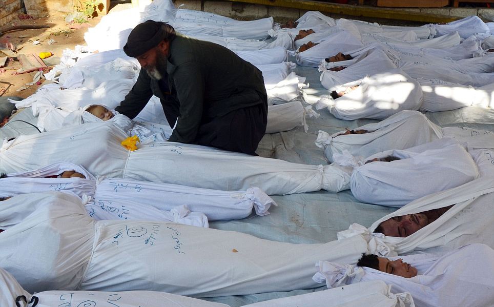 | Một người đàn ông bên cạnh thi thể của nhiều trẻ em chết vì hơi độc tại Ghouta, phía đông thủ đô Damascus, Syria ngày 21/8. Theo nhiều báo cáo, khoảng từ 355 đến 1.729 người, bao gồm nhiều trẻ em, đã thiệt mạng trong vụ tấn công bằng vũ khí hóa học này. Trong khi phe nổi dậy buộc tội chính quyền của Bashar al-Assad, chính phủ khẳng định họ không thực hiện vụ tấn công, đồng thời đổ lỗi cho phe đối lập. Ảnh: Reuters. |