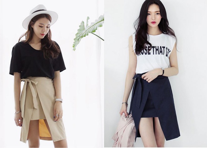 | 4. Váy tạp dề. Cùng mốt quần tạp dề, được thiết kế với 1 miếng vải dài quấn bên ngoài, váy tạp dề cũng bắt đầu “xâm lấn” giới công sở. Đây là kiểu váy rất “đẹp đôi” khi mix cùng áo thun kiểu dáng đơn giản, màu đơn sắc hoặc sọc ngang. |