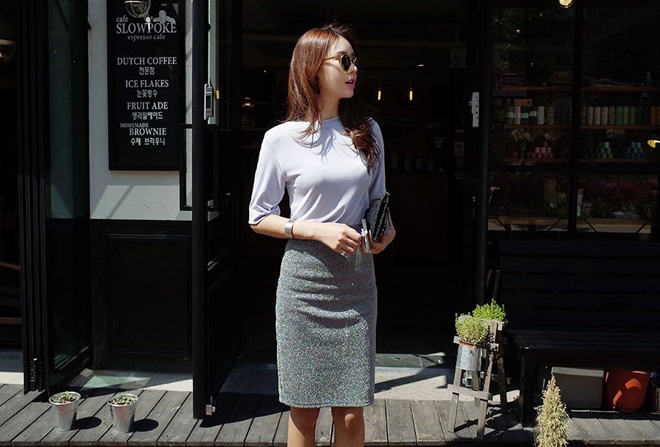 | Chất liệu vải ánh bạc cũng giúp chiếc váy bút chì đơn điệu thật khác lạ và quyến rũ giữa mùa nắng. |