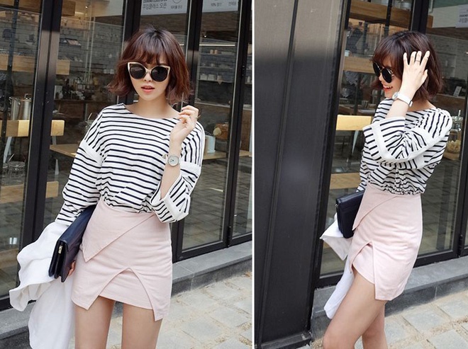 3. Váy bất đối xứng. Chỉ với 2 vạt váy không đều nhau cũng đủ cho bạn tạo ra 1 kiểu trang phục công sở thật mới lạ, cá tính.