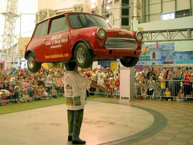 | Kỷ lục đội xe hơi bằng đầu thuộc về một người thợ đóng gạch có tên John Evans. Ông này đã đội một chiếc Mini Cooper lên đầu. |