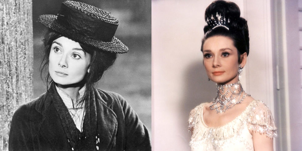 | Eliza Doolittle (Audrey Hepburn) trong My Fair Lady từ cô gái nghèo miền quê Cockney thành công nương trong nháy mắt với váy áo sang trọng, trang điểm tinh tế và nữ trang lấp lánh. |