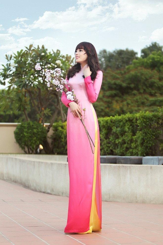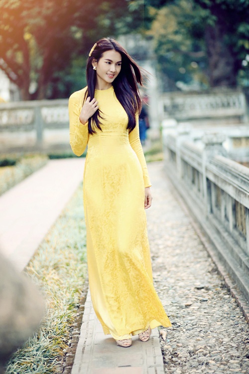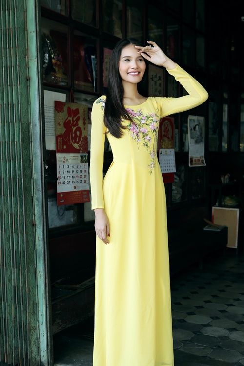 Áo dài tông màu vàng pastel được điểm cành hoa đào nhẹ nhàng trên thân áo mang lại nét duyên cho hoa hậu Hương Giang. Bà mẹ một con còn được đánh giá cao về độ tinh tế khi lựa chọn mẫu áo dài cổ thuyền phóng khoáng, hiện đại hợp xu hướng áo dài xuân 2015.