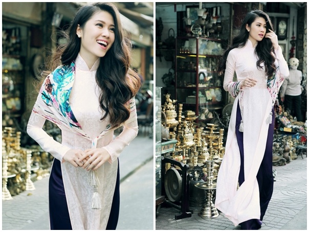 | MC Thu Hằng nổi bật trên đường phố Sài thành dịp đầu năm khi diện áo dài trắng, gấm hoa nhẹ nhàng, duyên dáng. Thiết kế đậm chất cổ điển khi kết hợp cùng quần tối màu, được nhấn nhá khăn voan cổ truyền khoác hờ trên vai. Trang phục đậm hơi thở truyền thống giúp người đẹp nổi bật giữa bối cảnh Tết rộn ràng. |