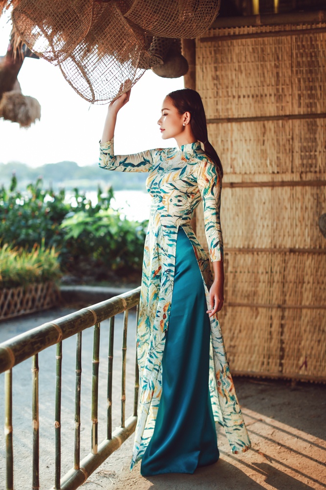 | Áo dài của Phan Như Thảo được khen ngợi là mang đậm nét đồng quê với họa tiết cỏ cây, hoa lá ấm áp hương xuân. Bối cảnh chụp ảnh khá ăn nhập cùng trang phục và chủ đề bộ ảnh giúp người mặc thu hút mọi ánh nhìn. Ngoại hình cân đối là ưu điểm để người mẫu tự tin khoe đường cong khi diện trang phục truyền thống. |