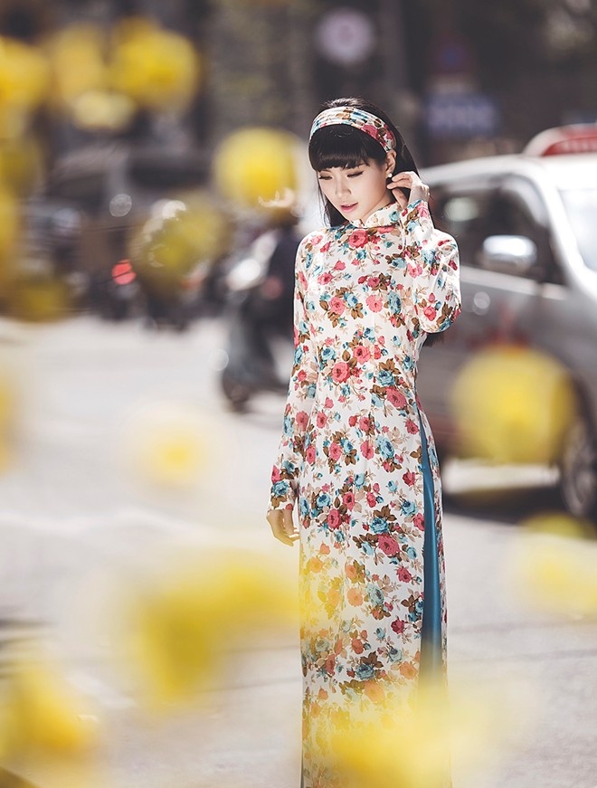 | Á hậu Diễm Trang góp mặt trong list trang phục đẹp mùa xuân nhờ bộ áo dài họa tiết hoa nhẹ nhàng, cùng băng-đô đồng họa tiết. Bộ cánh hơi hướng thời trang những năm 1970 của NTK Minh Châu giúp người đẹp gốc Vĩnh Long ghi điểm hình ảnh đẹp đầu năm mới. |