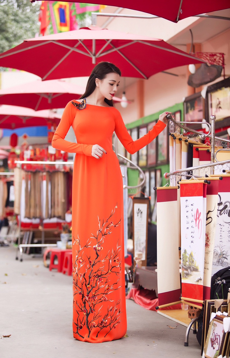 | Trà Ngọc Hằng chọn áo dài tông màu cam nổi bật của NTK Đinh Văn Thơ khi dạo phố xuân. Thiết kế cổ thuyền hiện đại, phù hợp với hình ảnh trẻ trung, năng động của người mặc. Không chỉ vậy, tông màu và họa tiết còn rất hòa hợp với bối cảnh xuân phương Nam. |