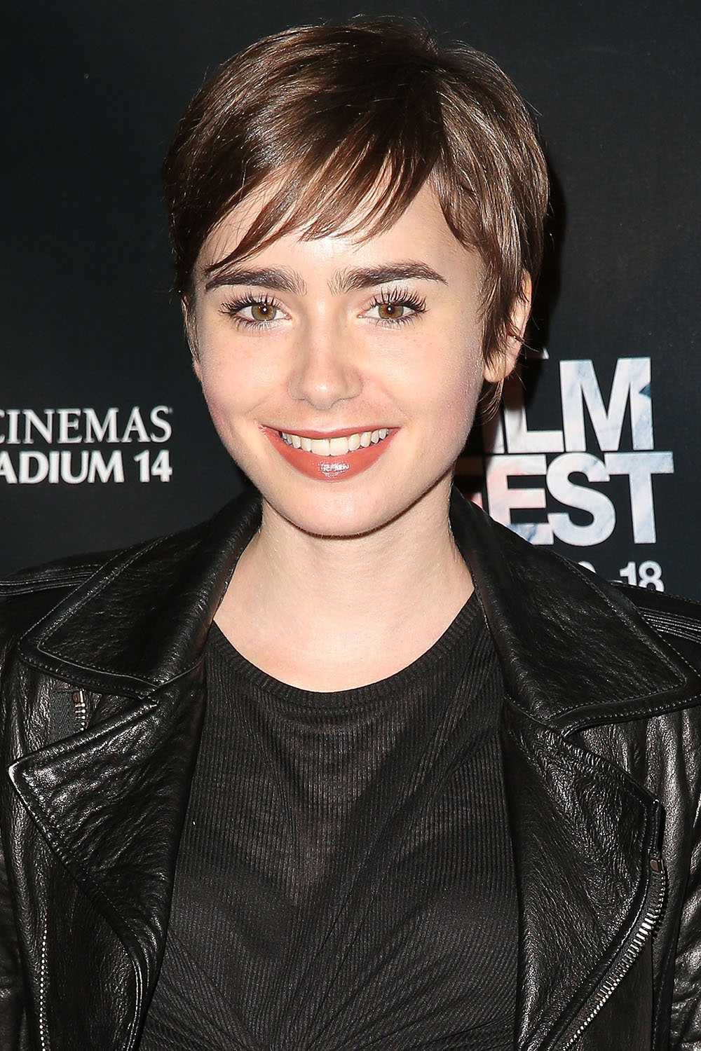 | Llly Collins: Với gương mặt nhỏ nhắn, hãy mạnh dạn thử kiểu tóc pixie mái xéo như nữ diễn viên xinh đẹp này. |