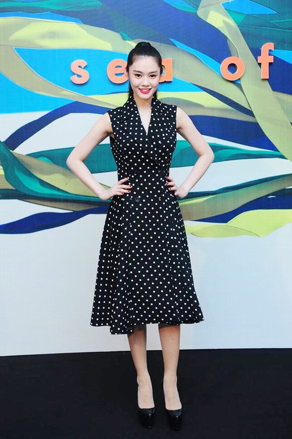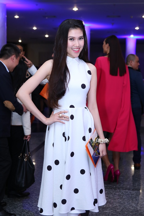 | Các nốt chấm bi được thiết kế thoáng mắt tạo vẻ đáng yêu cho người mặc, đây là lựa chọn rất phù hợp với vóc dáng của Thu Hằng. |