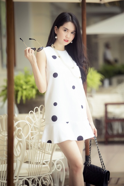 | Ngọc Trinh gây ấn tượng với vẻ trẻ trung của chiếc đầm loe có điểm xuyết chấm bi xinh xắn. |