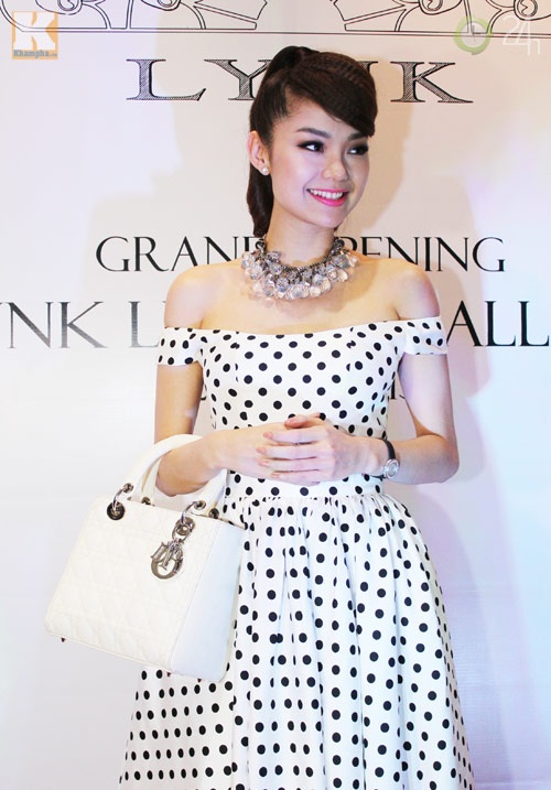 | Khánh Thi với chiếc đầm chấm bi lệch vai rất quyến rũ giúp khoe trọn đường cong của người đẹp. |