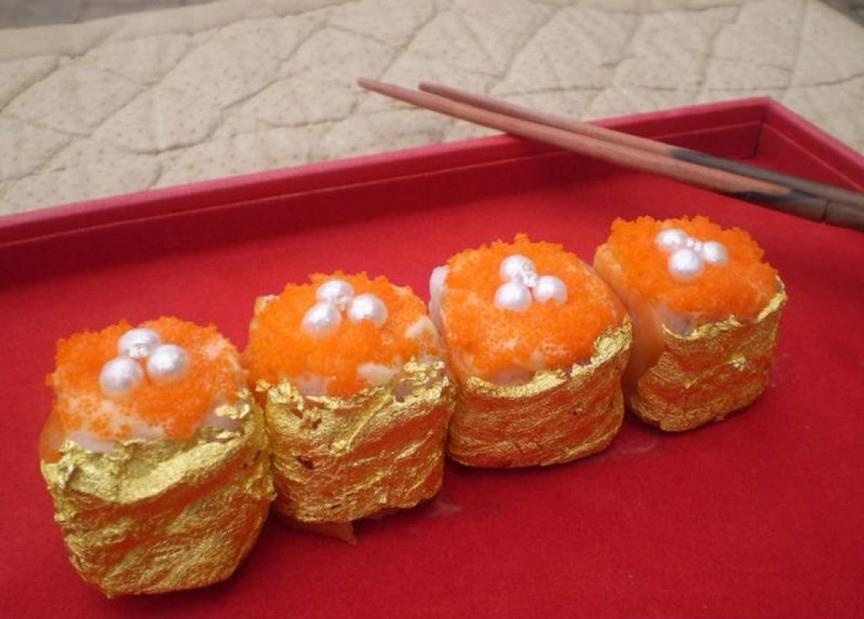 Sushi del Oriente - 1.980 USD (Milan, Italy): Đầu bếp Angelito Araneta Jr. đã tạo ra món ăn độc đáo này vào năm 2010. Sushi del Oriente gồm nghệ tây, gan ngồng, hải sâm, trang trí bằng 12 viên ngọc trai Palawan, 4 viên kim cương 0,2 carat và bọc trong giấy vàng. Tuy nhiên, món sushi này chỉ để chiêm ngưỡng chứ không được bán