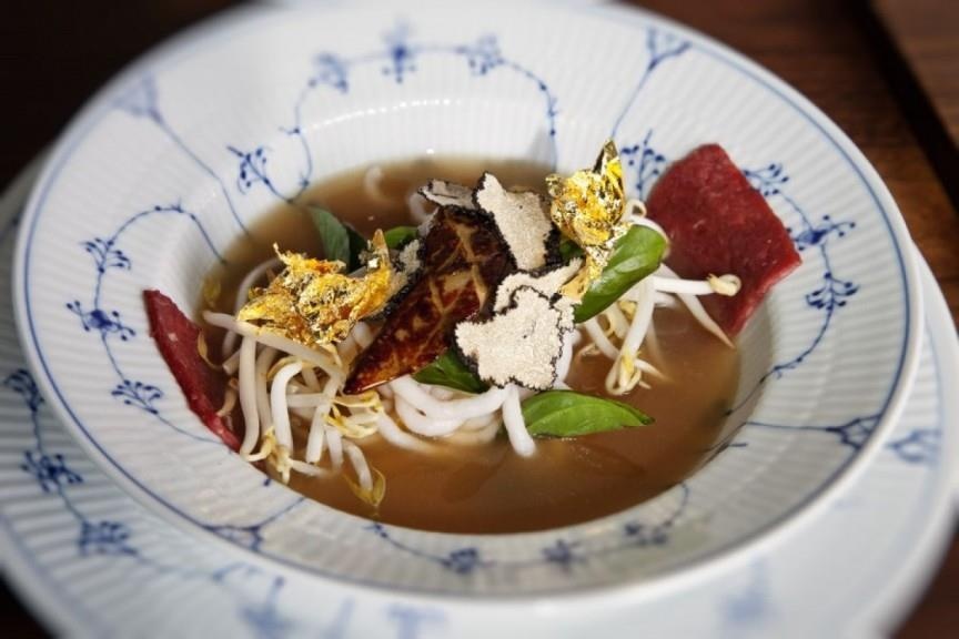 Phở AnQi - 5.000 USD (California, Mỹ): Tới nhà hàng Tiato ở Santa Monica, bạn sẽ có cơ hội thưởng thức bát phở có giá 5.000 USD gồm có thịt bò Wagyu, sợi phở làm từ tôm hùm xanh quý hiếm, nước gan ngỗng, nấm Truffle Alba trắng. Nhà hàng mất tới 7 ngày để chuẩn bị cho món ăn này. Bát phở được bán đấu giá gây quỹ cho bệnh viện trẻ em ở Los Angeles và hạt Orange.