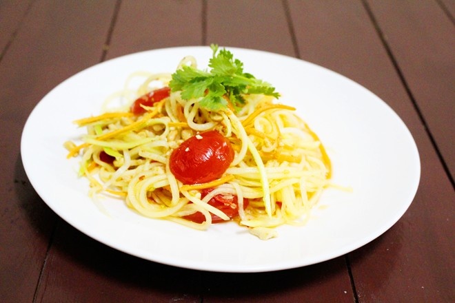 2. Som tam là một món ăn pha trộn giữa gỏi đu đủ, tôm khô, ba khía và xôi nếp được nấu trong ống tre. Nếu nhìn bằng mắt, som tam khá giống nộm đu đủ, song cách chế biến, gia vị lại khác hẳn. Món ăn này có vị cay, chua, thơm rất "bắt mồi".
